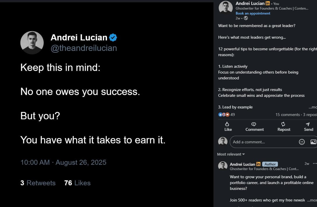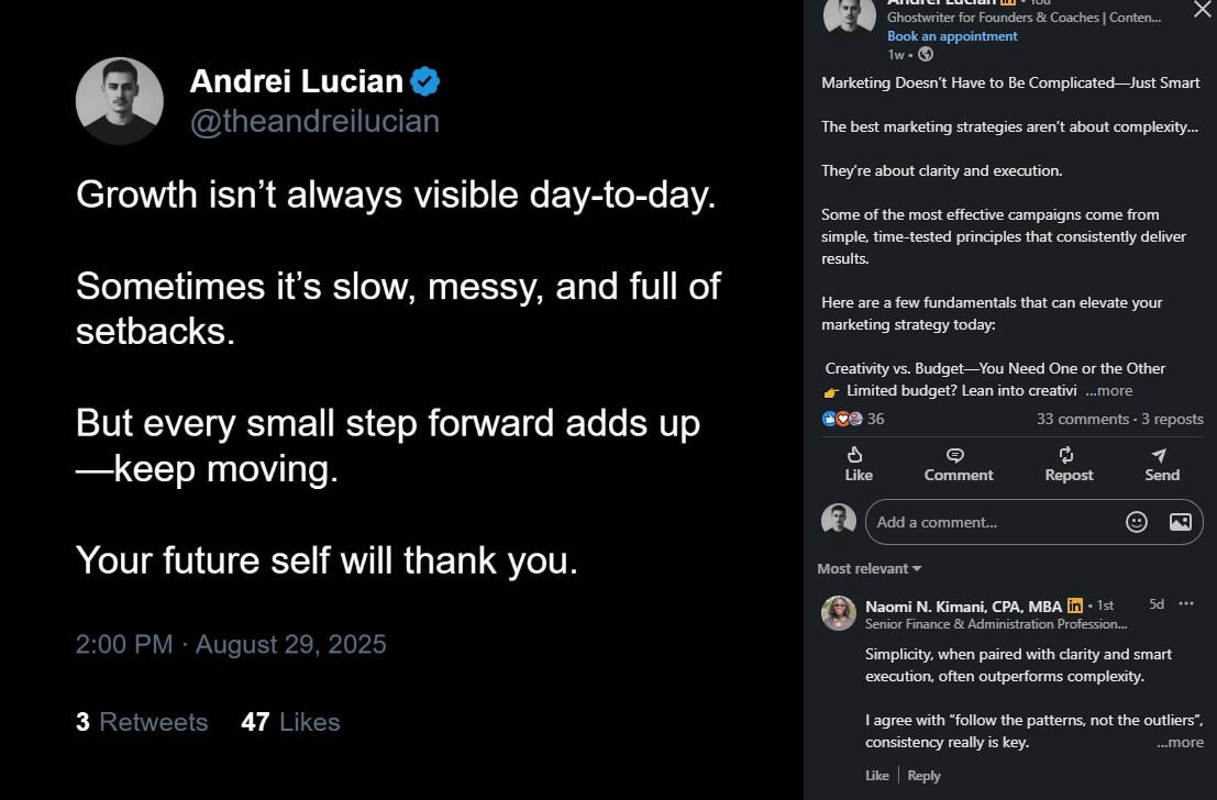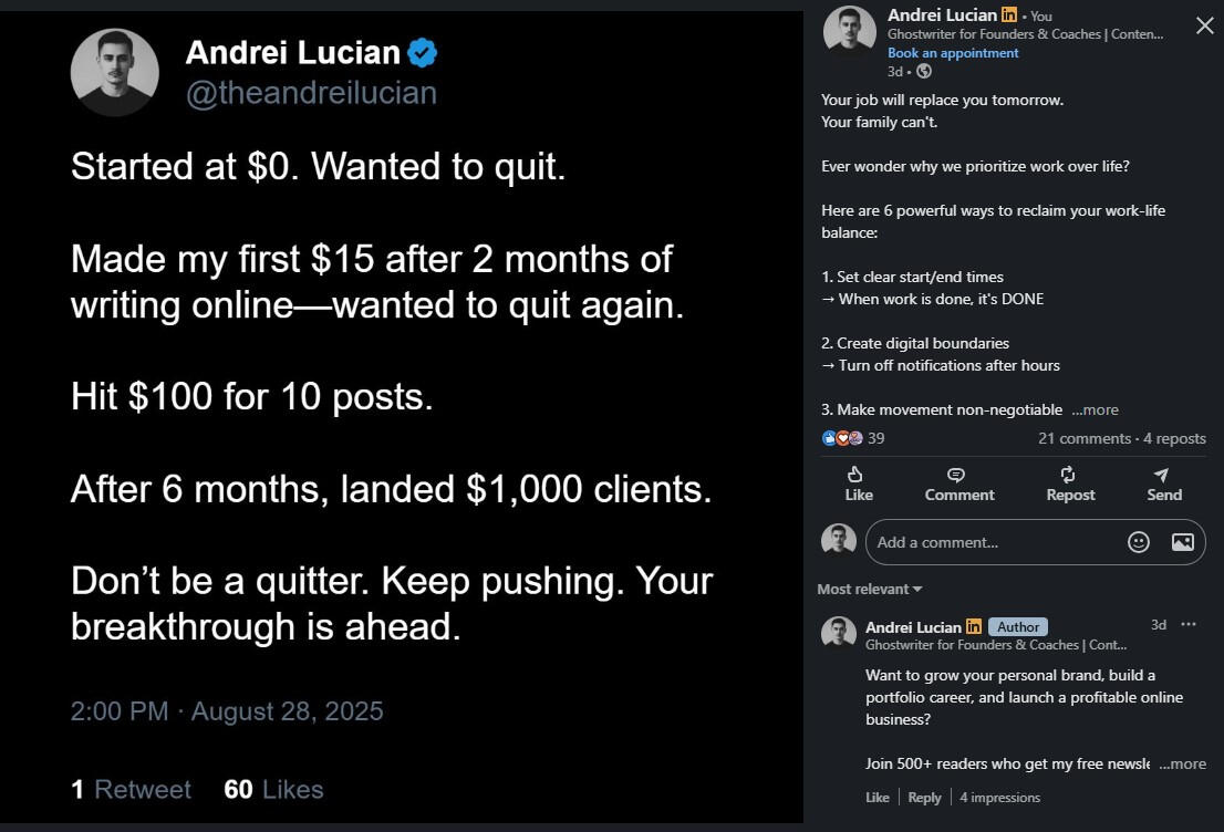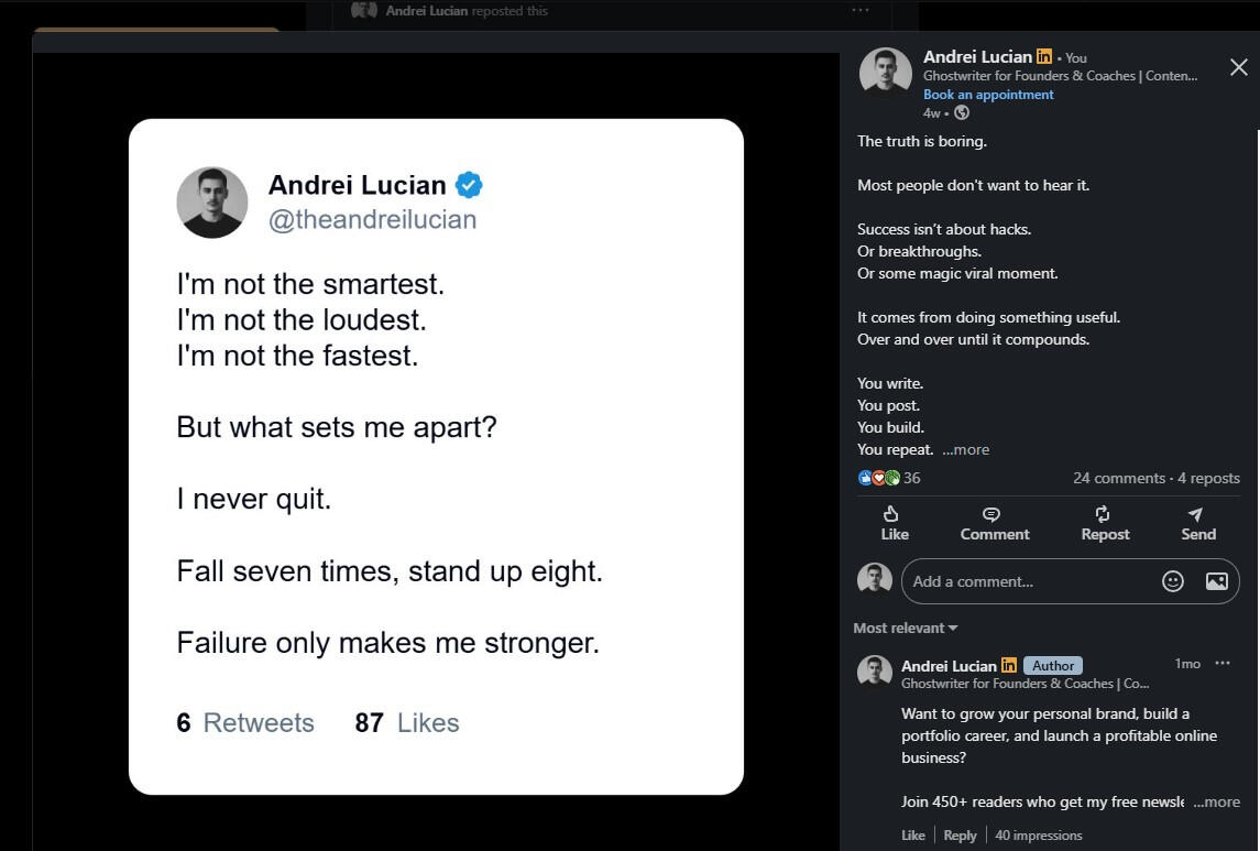 I’m human like you.I’ve tried, failed, succeeded, and kept going. Here’s my journey:I quit architecture in my final year. The pandemic hit, online courses were terrible, and I realized it wasn’t for me.Then I tried making money online abroad and failed at:Coding—couldn’t turn knowledge into resultsAffiliate marketing—spent money, earned nothingDropshipping (twice)—products didn’t sellTrading—lost more than I gainedEvery failure taught me lessons. Then I discovered copywriting, dove into marketing and psychology, and found my path in ghostwriting.Since 2024, my personal brand journey on X (formerly Twitter) has achieved:First $15 in 2 months, first $100 in 4 monthsHelped 30+ clients grow personal brands on X and LinkedIn-> LinkedIn: 11.5K followers, one post hit 3K impressions in under 4 days-> X: 6.1M impressions in 90 days-> Instagram: 1.5M views in 23 days, grew to 6K followers-> Newsletter: 550+ subscribersI coach, ghostwrite, and help people get seen.My goal?To help you stand out and grow your brand—just like I’ve done for myself and my clients.