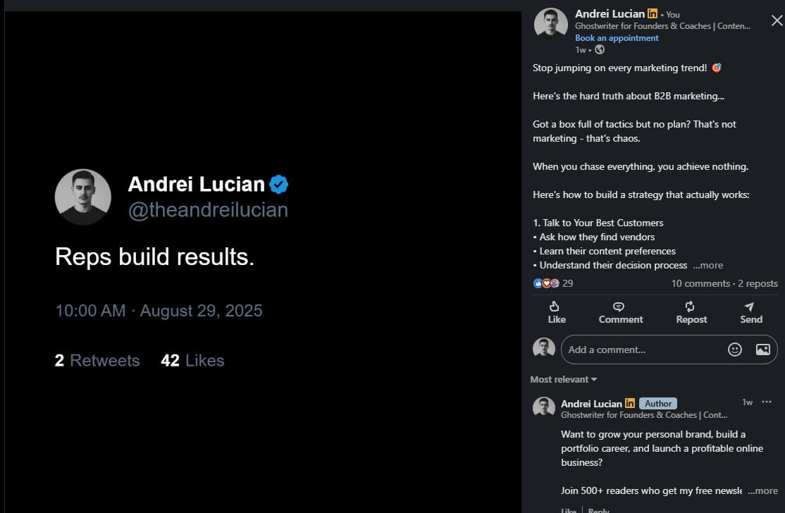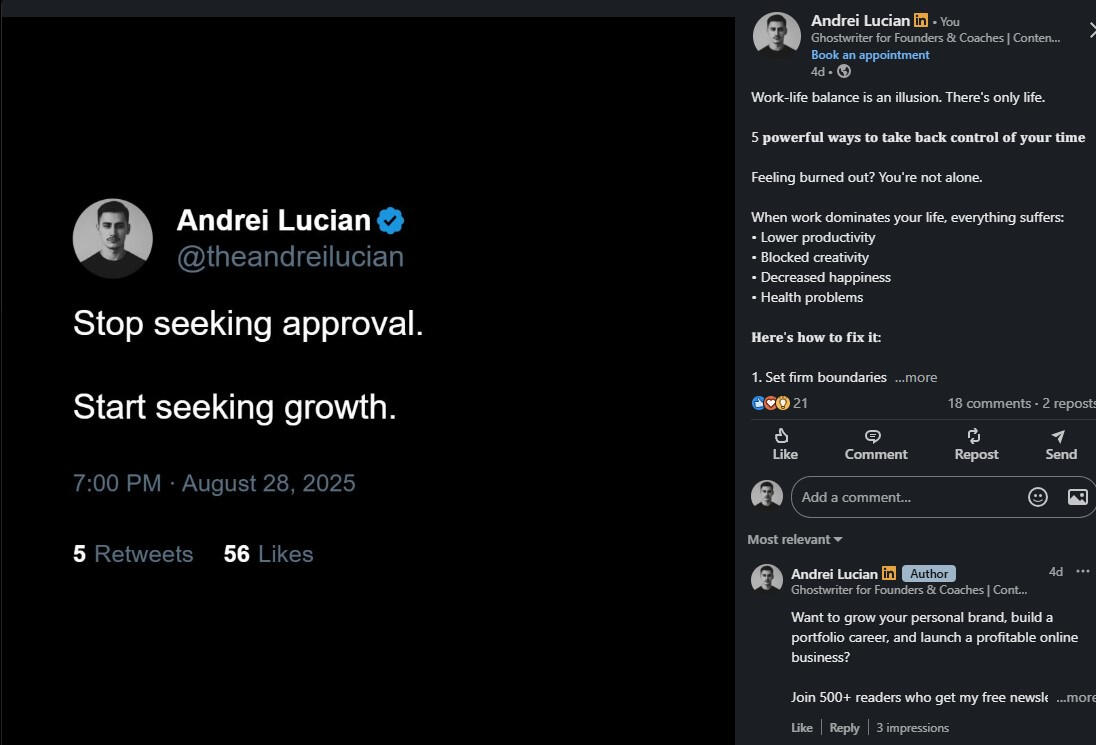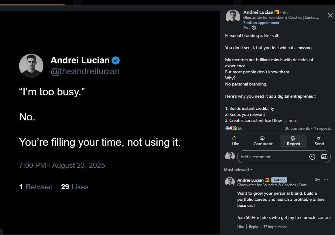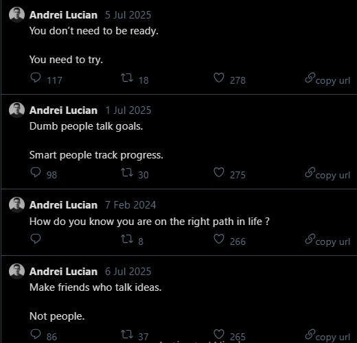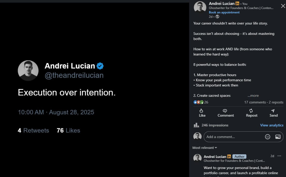 I’m human like you.I’ve tried, failed, succeeded, and kept going. Here’s my journey:I quit architecture in my final year. The pandemic hit, online courses were terrible, and I realized it wasn’t for me.Then I tried making money online abroad and failed at:Coding—couldn’t turn knowledge into resultsAffiliate marketing—spent money, earned nothingDropshipping (twice)—products didn’t sellTrading—lost more than I gainedEvery failure taught me lessons. Then I discovered copywriting, dove into marketing and psychology, and found my path in ghostwriting.Since 2024, my personal brand journey on X (formerly Twitter) has achieved:First $15 in 2 months, first $100 in 4 monthsHelped 30+ clients grow personal brands on X and LinkedIn-> LinkedIn: 11.5K followers, one post hit 3K impressions in under 4 days-> X: 6.1M impressions in 90 days-> Instagram: 1.5M views in 23 days, grew to 6K followers-> Newsletter: 550+ subscribersI coach, ghostwrite, and help people get seen.My goal?To help you stand out and grow your brand—just like I’ve done for myself and my clients.